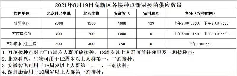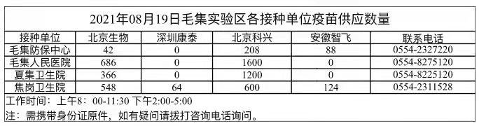 毛集实验区各接种单位新冠疫苗供应数量(19日):