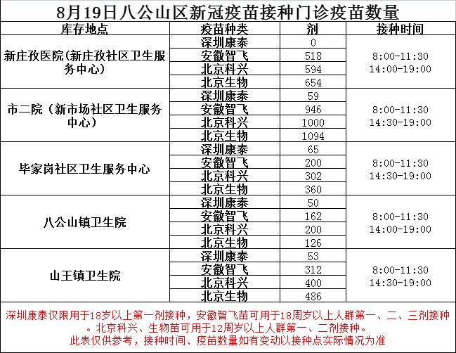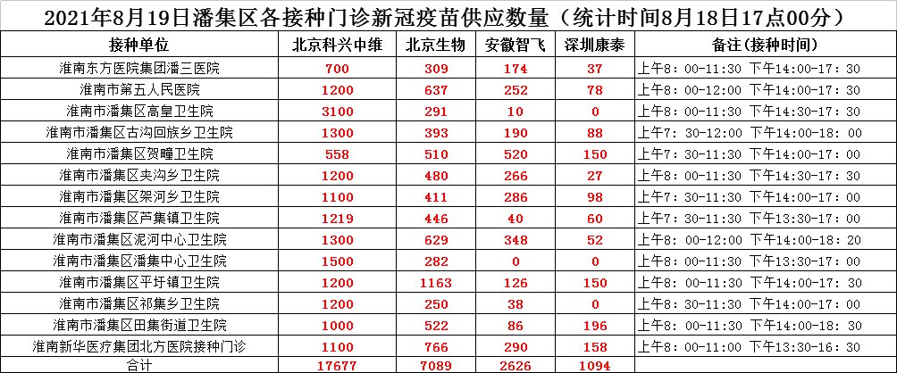 八公山区各接种门诊新冠疫苗供应数量(19日):