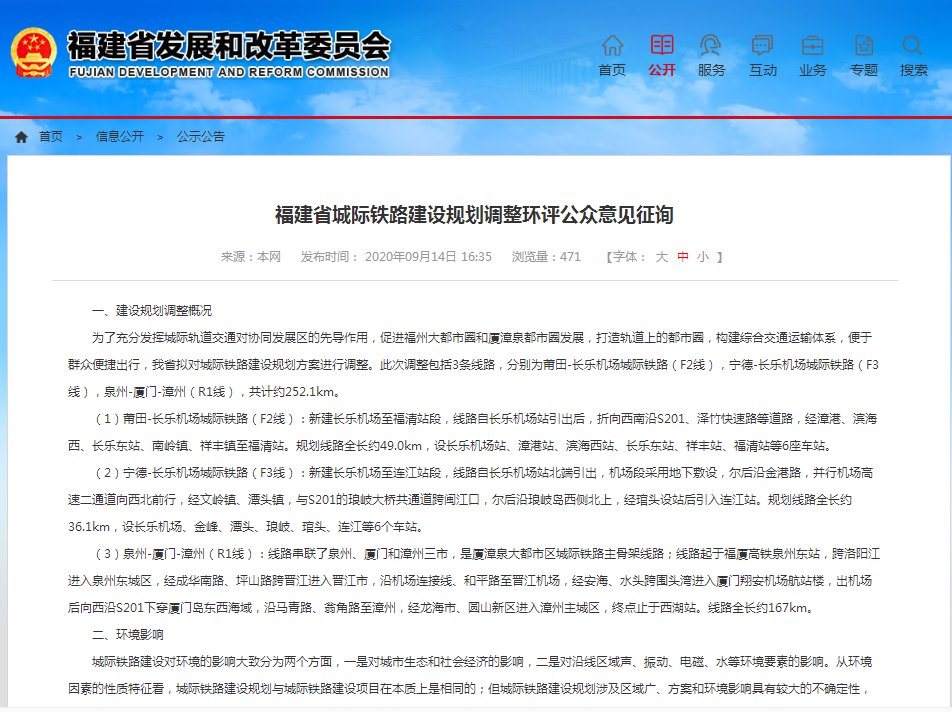 2020年9月14日,福建省发展和改革委员会网站发布《福建省城际铁路建设规划调整环评公众意见征询》,拟对福建省城际铁路建设规划方案进行调整。此次调整包括3条线路,分别为莆田-长乐机场城际铁路(F2线),宁德-长乐机场城际铁路(F3线),泉州-厦门-漳州(R1线),共计约252.1km。