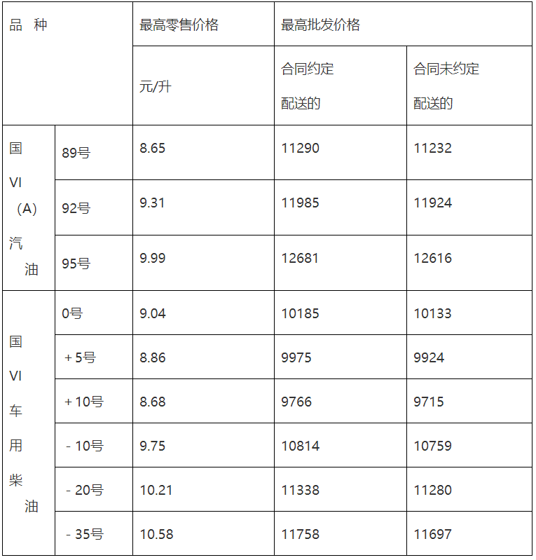 2.表中所列价格为国VI标准的汽、柴油价格。