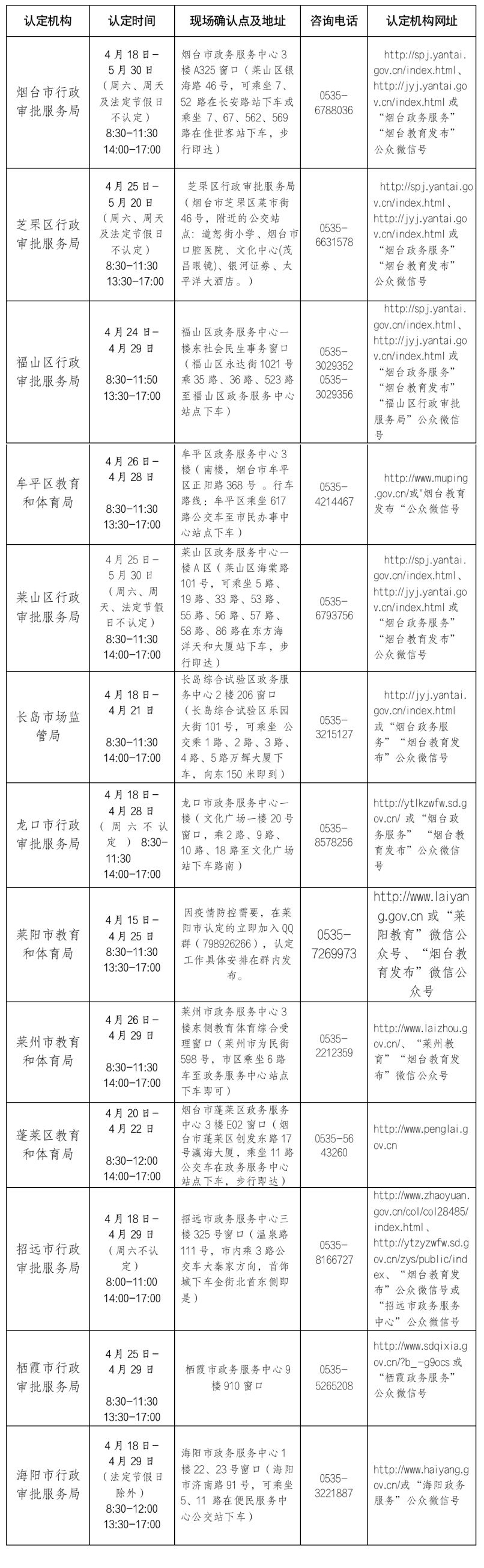 申请高中、中职、中职学校实习指导教师资格人员选择烟台市行政审批服务局为认定机构,现场确认点为烟台市政务服务中心;申请初中、小学、幼儿园教师资格人员选择户籍、居住所在地的或学校所在地县市区教育行政部门(县市区行政审批服务局)为认定机构,并选择相应的确认点。