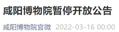 根据疫情防控工作需要,咸阳博物院自2022年3月15日(星期二)15:00起暂停对外开放,恢复开放时间另行通知。