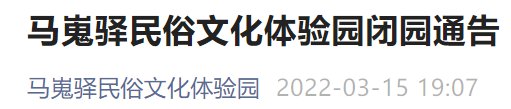 为了响应政府号召,进一步加强新冠肺炎疫情防控工作,马嵬驿民俗文化体验园决定自2022年3月15日19:00起闭园,恢复开园时间另行通知。