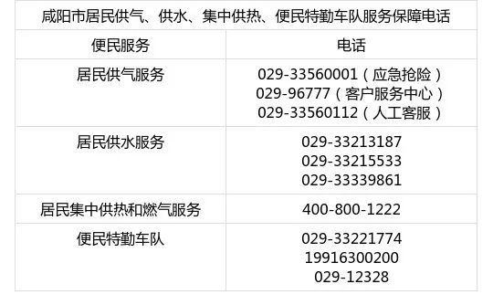 咸阳市居民供气、供水、集中供热、便民特勤车队服务保障电话