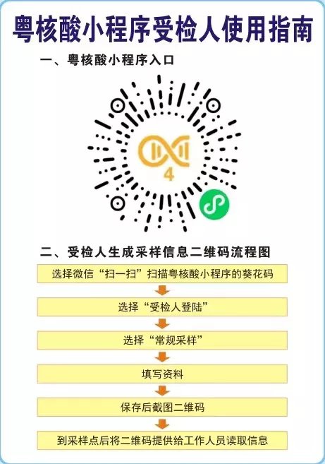 出发去做核酸检测前,要记得准备粤核酸码,老人、孩子可由家人代为登记,数量不限。粤核酸码三部曲走起:①扫码、②录入信息、③截图保存。现场带上有效身份证件,给医护人员扫码核验。