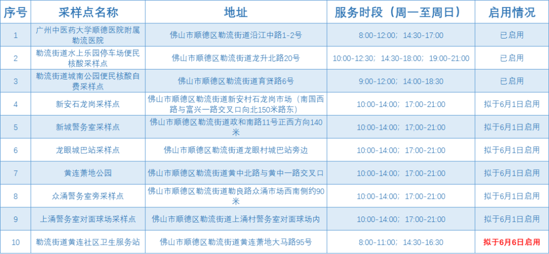 ➤【勒流】自2022年6月1日起,勒流街道设10个便民核酸采样点。