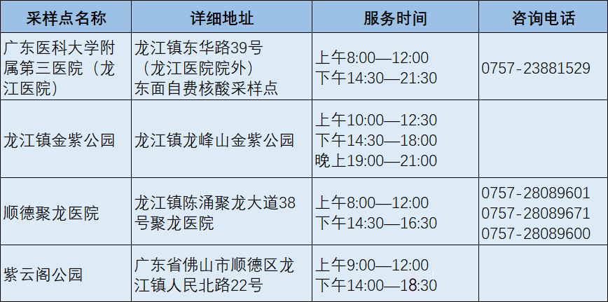 市民可前往广东医附三院龙江医院或龙江镇便民核酸采样点(龙江镇金紫公园)进行核酸检测。