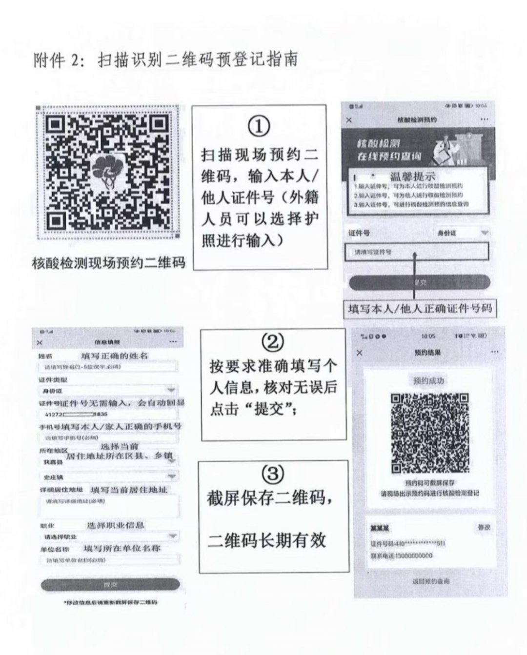 1.关注“放新办”微信公众号,点击公众号底部菜单“核酸检测”→“核酸检测预约”,输入身份证号,按照要求填写个人信息后,点击提交生成个人预约二维码,截屏保存,预约二维码长期有效。