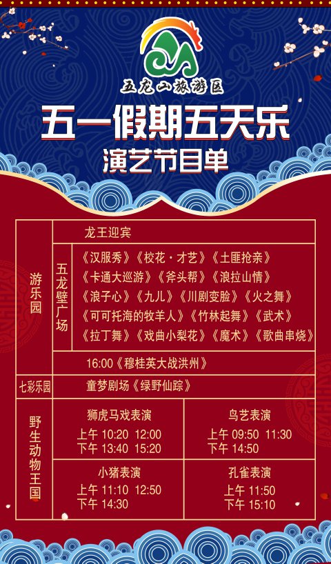 导航五龙山野生动物王国→野生动物王国→内通进入游乐园30元/人(不享受女士免票政策)→家庭过山车→碰碰车→小火车→青蛙跳→自控飞机→超级秋千→勇敢救火队→逍遥水母→果虫滑车→5D影院→旋转的士高→飞行塔→大摆锤→魔域鬼屋→太空梭(跳楼机)→悬挂过山车→穆桂英大战洪州(带家人必看的一场实景演艺)→夜游灯光节(观看五一五天乐演出)→结束一天快乐之旅。