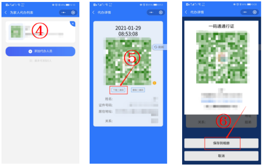2.代办完成后,可在详情页面点击“下载二维码”可将当前家人“一码通通行证”保存到相册,打印纸质版,用于场所主动出示。