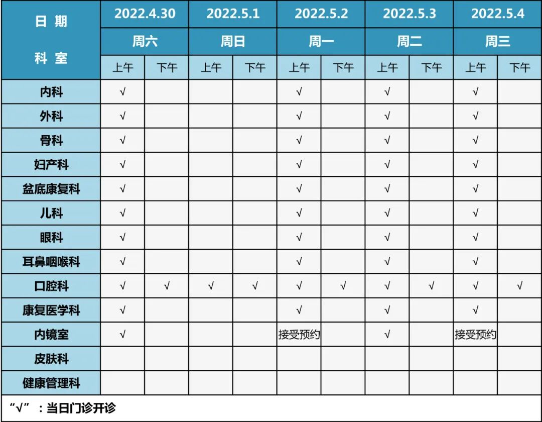 ③ 4月30日、5月2日-5月4日,内科、外科、骨科、妇产科、儿科、耳鼻咽喉科、眼科、康复医学科、盆底康复科上午开诊,下午停诊;