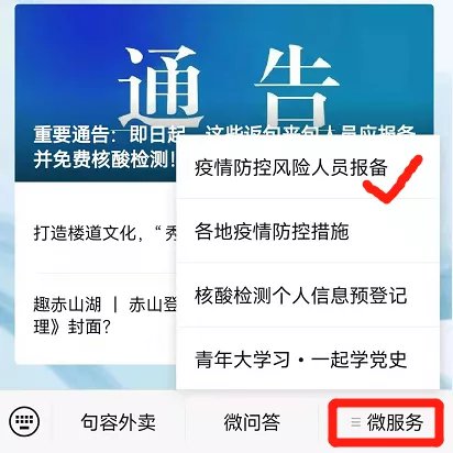 检测对象来句返句后应12小时内向属地村(居)委会报备(可通过关注并进入“句容发布”微信公众号,选择底边栏菜单:“微服务”-“疫情防控风险人员报备”),