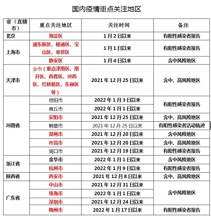(更新情况:1月16日浙江省宁波市和1月17日陕西省咸阳市、河南省洛阳市调整为低风险地区,1月17日重点关注地区增加广东省梅州市和天津市东丽区。)