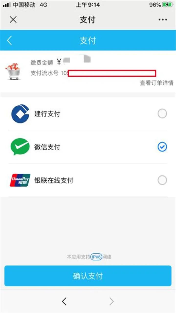 5.进入“支付”页面,选择“微信支付”,最后完成付款。