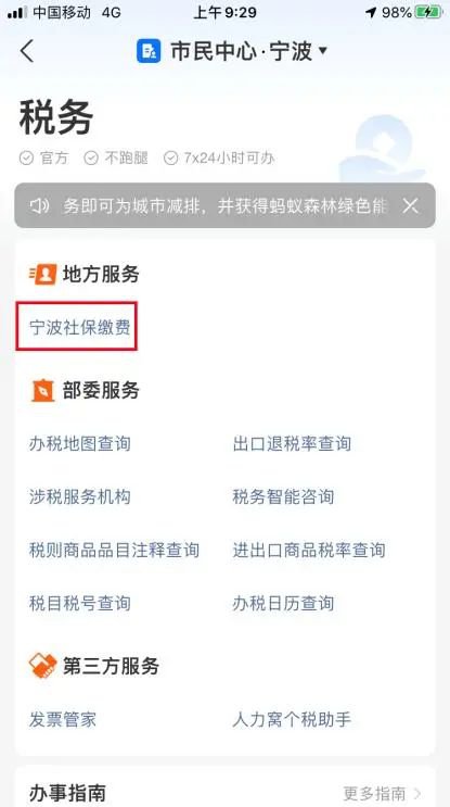 1.打开手机支付宝,依次点击“市民中心”——“税务”(注意:需右翻至第二页)——“宁波社保缴费”,点击进入社保缴费页面。