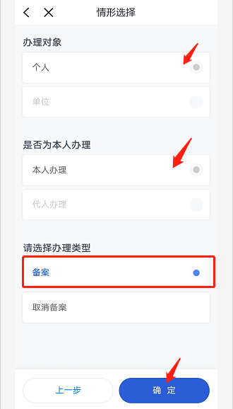 2.进入“情形选择”页面,“办理对象”、“是否为本人办理”两项内容信息默认→选择办理类型“备案”→点击“确定”。