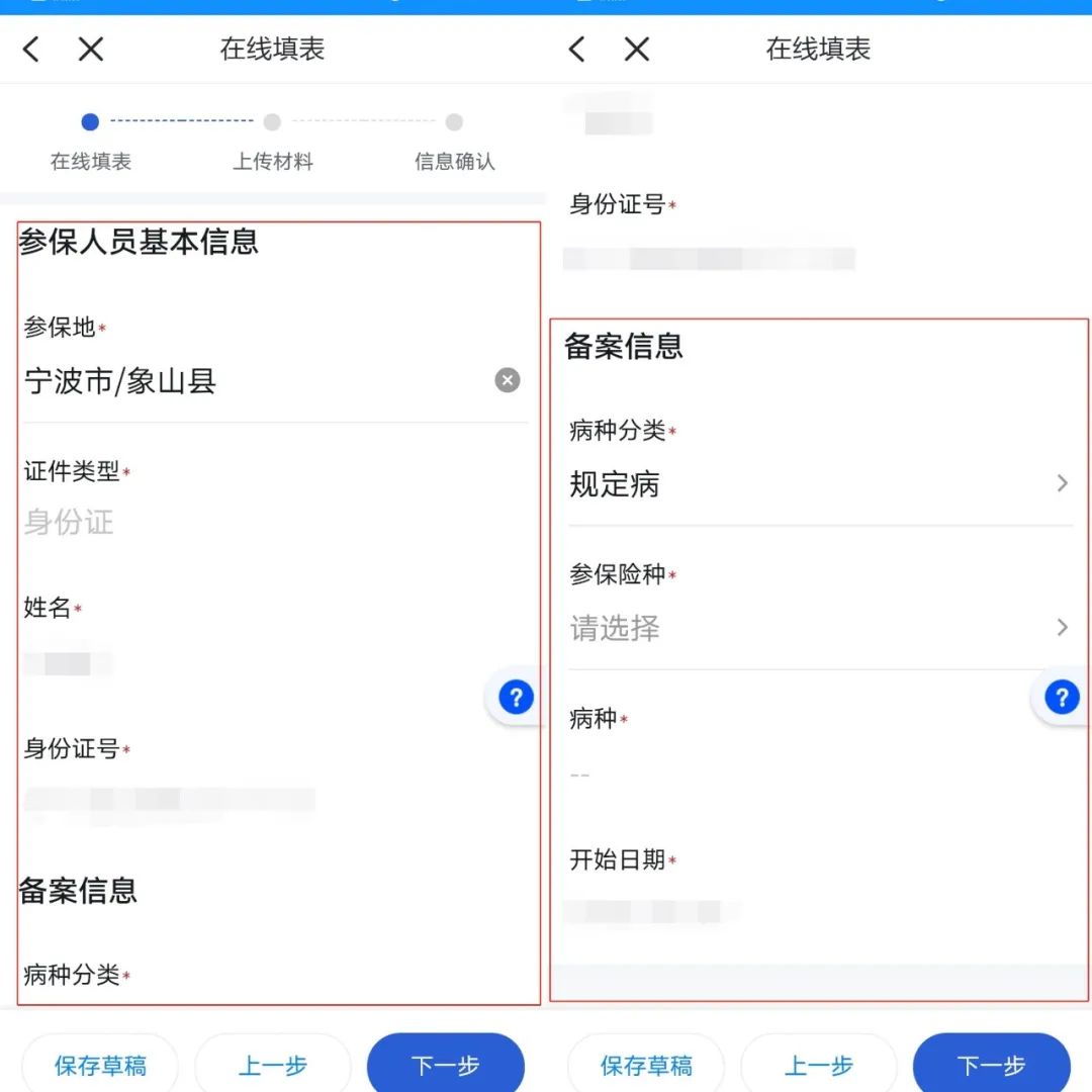 3.进入“在线填表”页面,在“参保人员基本信息”栏选择“参保地”(按参保人实际参保地进行选择)→“证件类型”、“姓名”、“身份证号”按系统默认。