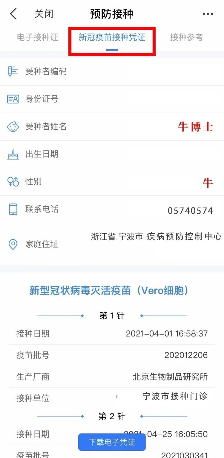 在接种完新冠疫苗后,点击【电子接种证】,并选择【新冠疫苗接种凭证】查询相关接种信息。