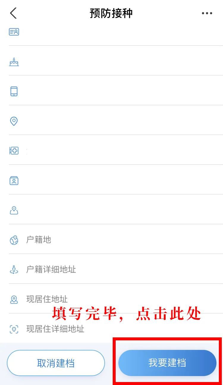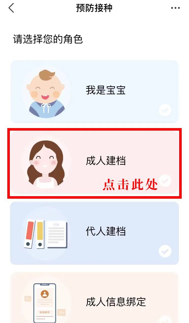 在支付宝完成上述扫码操作之后,您会进入到以下界面,首先点击第二个【成人建档】后填写您的个人信息,并选择就近的接种门诊进行预约,最后点击右下角的【我要建档】。