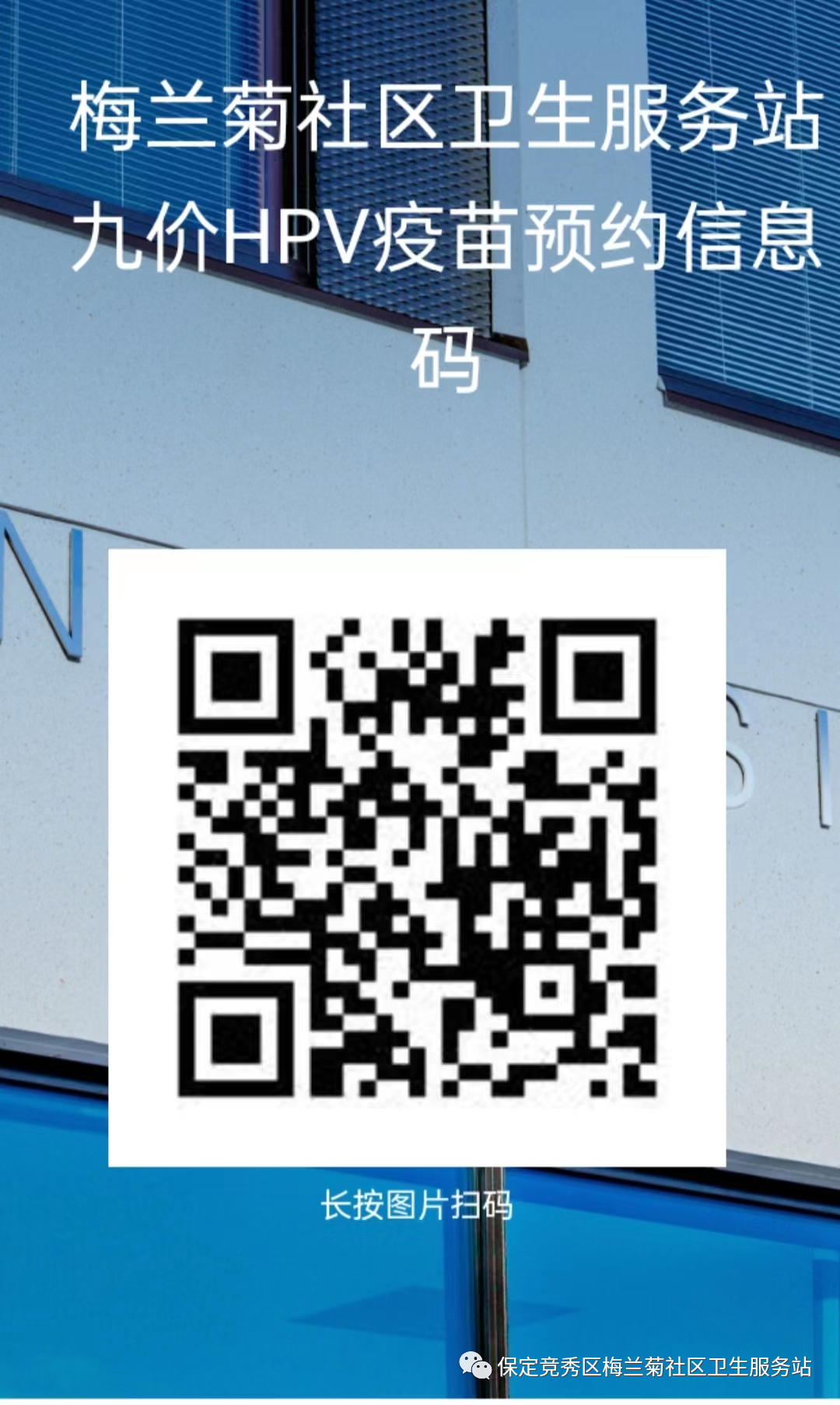 竞秀区梅兰菊社区卫生服务站接种门诊提醒您:请需要接种九价宫颈癌疫苗受种者,扫相关疫苗的二维码输入个人信息进行预约登记,因疫情原因和疫苗供货问题,我们采取先登记信息,收集完预约信息后将电话进行通知。