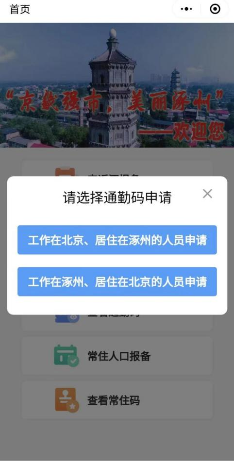 点击“通勤人员报备”,选择“工作在北京,居住在涿州的人员申请”或“工作在涿州、居住在北京的人员申请”。