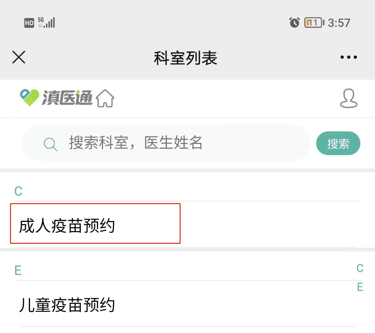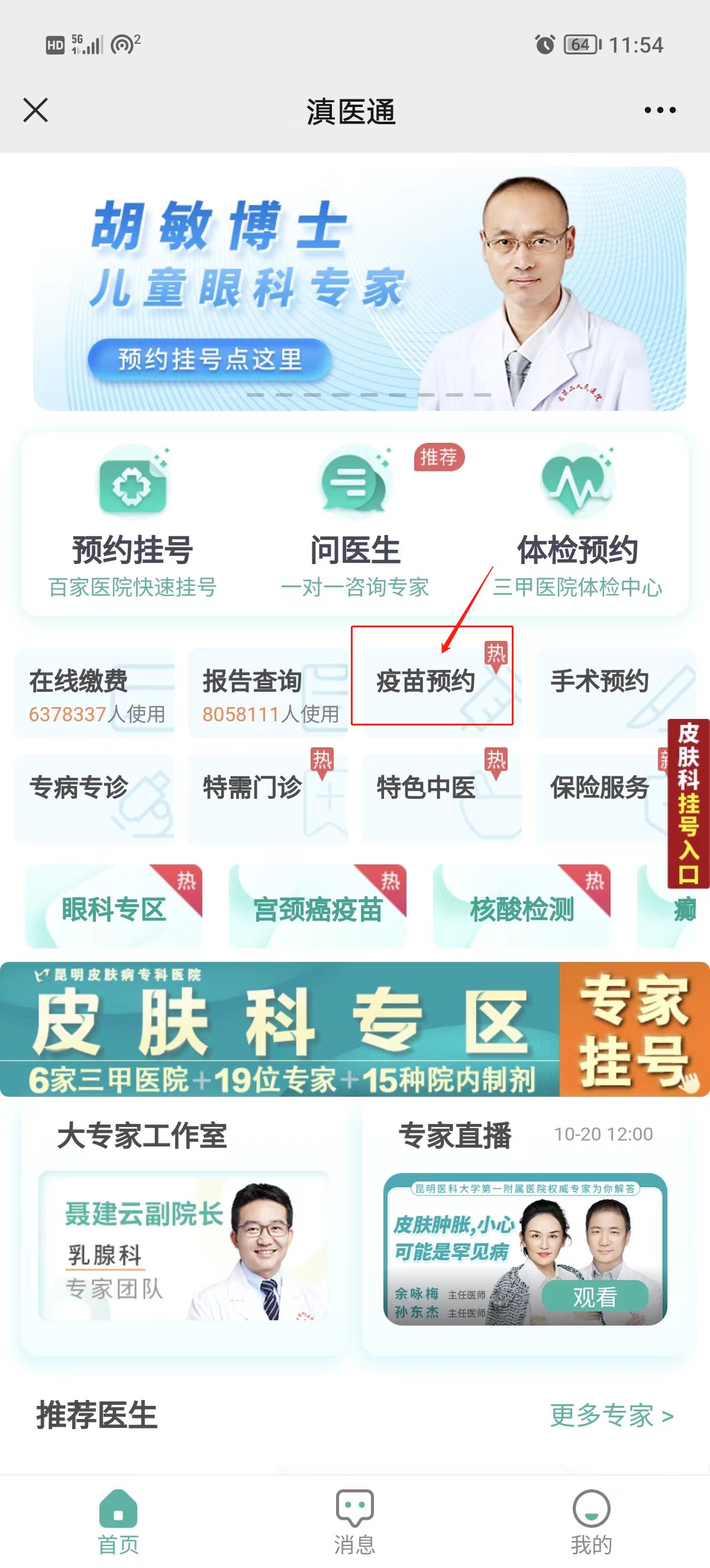 第一步:进入公众号预约挂号(获取预约入口直接进入),进入【滇医通】预约入口。