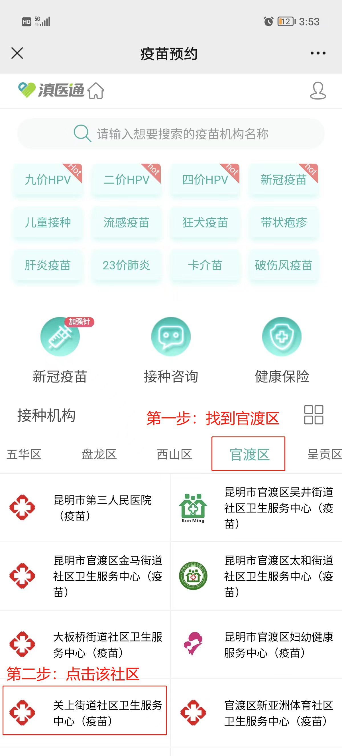 第三步:在页面里点击找到【官渡区】,然后点击【官渡区关上街道社区卫生服务中心(疫苗)】