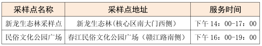 便民核酸采样点时间安排如下,“应检尽检”重点人群可持“免费采样证明"到就近便民核酸采样点采样;个人需要的愿检人群,按规定收费。