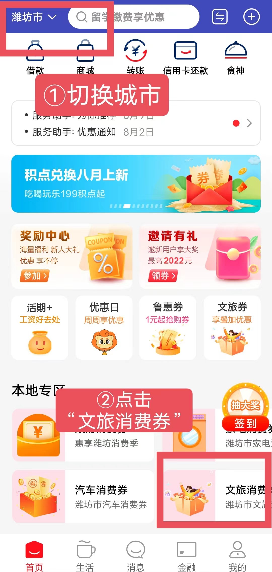 第一步,进入云闪付APP,点击左上角切换城市“潍坊市”,点击右下角“文旅消费券”。