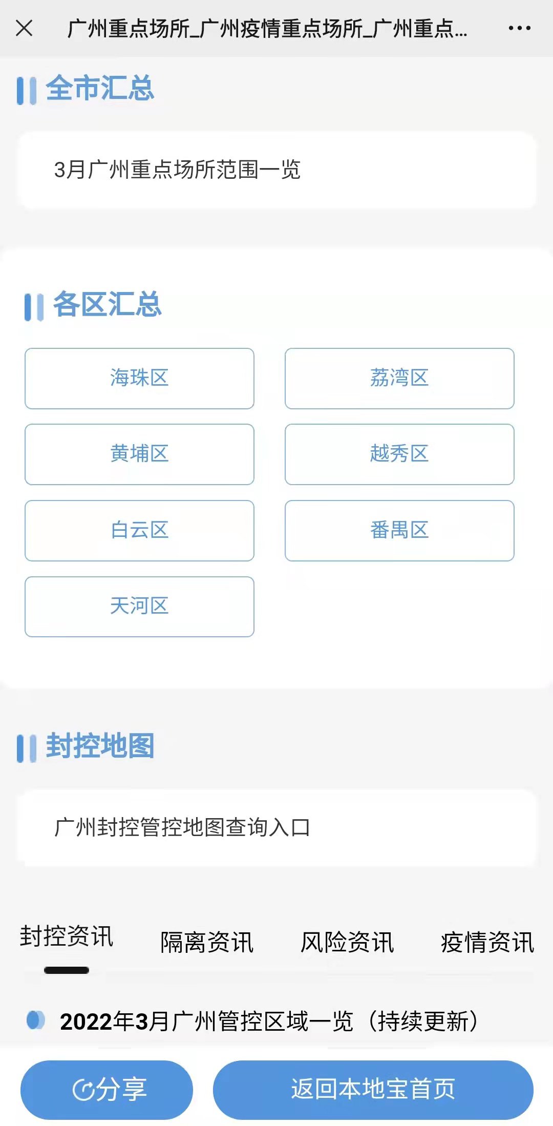 备注:可查询广州重点场所最新消息、全市最新消息、各区重点场所汇总以及获取封控管控地图查询入口