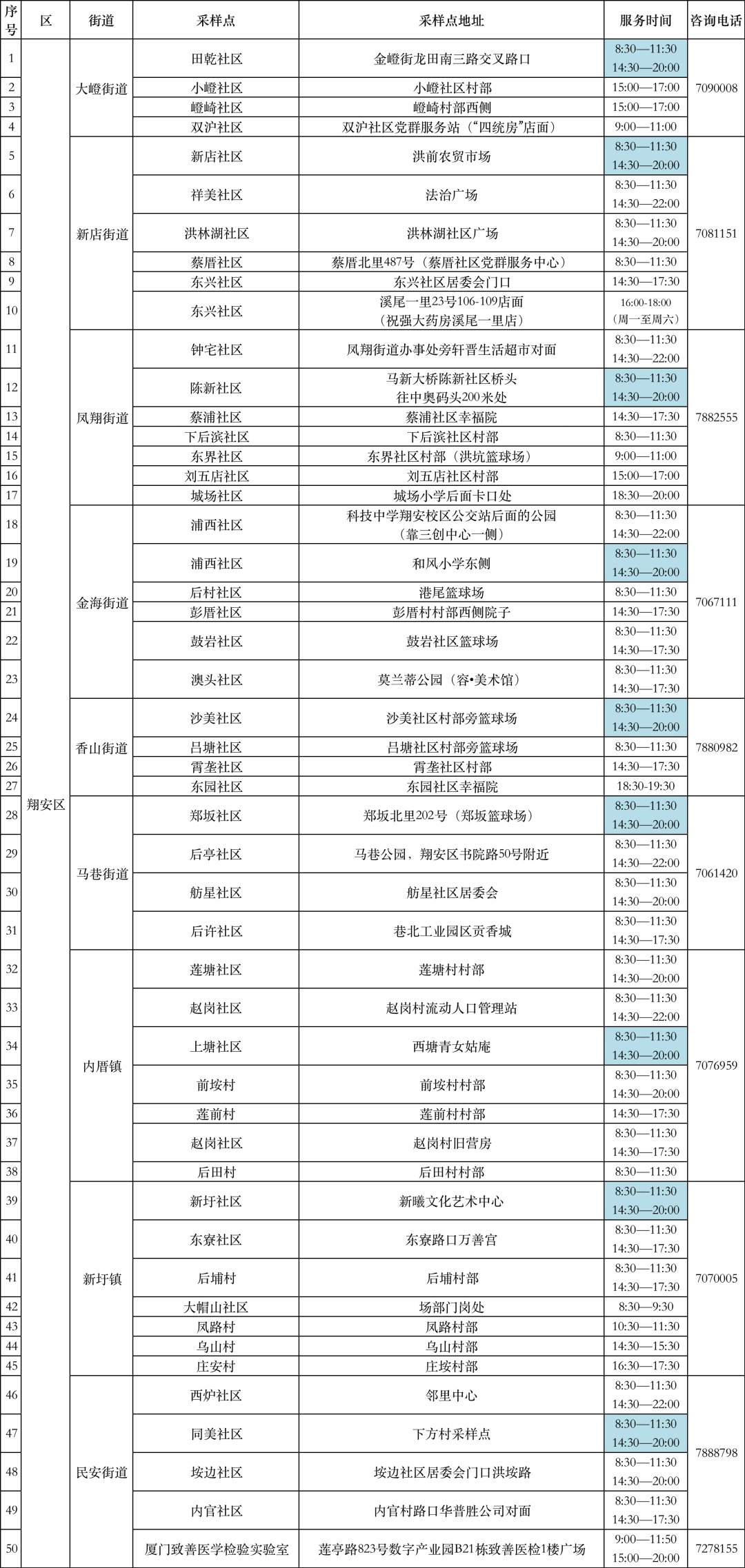 思明区(点击可看大图)采样时间为早上8:30-11:30,下午14:30-20:00。(以各检测点时间为准)
