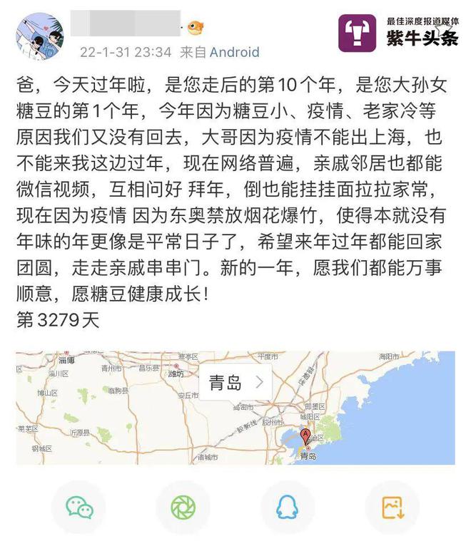 爸,今天过年啦,是您走后的第10个年,是您大孙女糖豆的第1个年……现在网络普遍,亲戚邻居也都能微信视频,互相问好拜年,倒也能拉拉家常……第3279天。