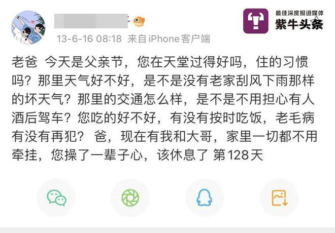 老爸,今天是父亲节,您在天堂过得好吗……您吃得好不好,有没有按时吃饭,老毛病有没有再犯?爸,现在有我和大哥,家里一切都不用牵挂,您操了一辈子心,该休息了。第128天 。