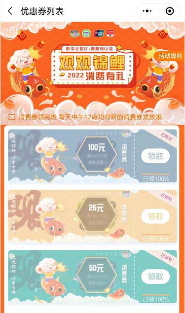 3.点击“优惠领取”,进入后点击“观观锦鲤·消费有礼”