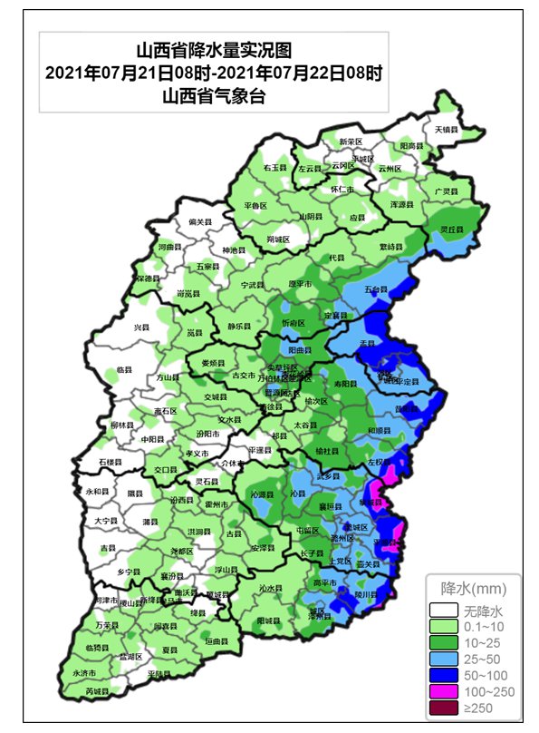 7月21日08时至7月22日08时,太原、阳泉、长治和晋城的全域,忻州和晋中的大部,大同、朔州、吕梁和运城的部分以及临汾的局部共82个县(市、区)出现降雨,降水量介于0.1~114.1毫米之间,最大出现在平顺,超过100毫米;黎城、昔阳在50~100毫米之间;阳泉全域、长治大部、忻州东部、晋中东部、太原北部有19个县(市、区)在25~50毫米之间。