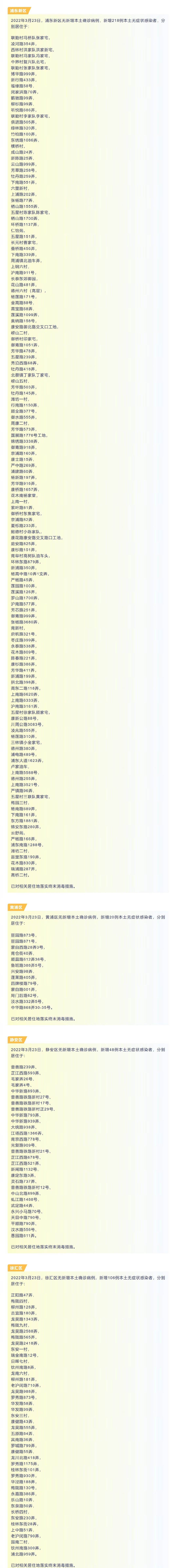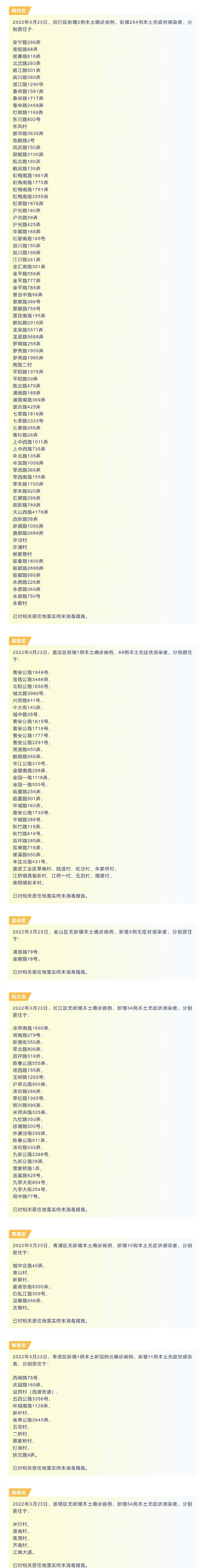2022年3月23日0—24时,新增本土无症状感染者979例。(闵行区254例,浦东新区218例,徐汇区106例,宝山区69例,嘉定区68例,崇明区54例,静安区48例,普陀区34例,松江区34例,虹口区26例,黄浦区20例,长宁区11例,杨浦区11例,奉贤区11例,青浦区10例,金山区5例)