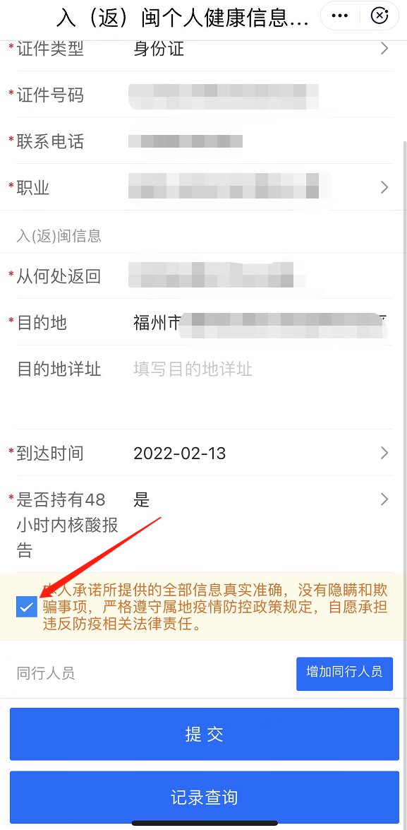 根据省级要求,全省已经全面启用返闽人员个人健康报备小程序,供返乡人员进行个人健康报备。省外入(返)闽人员在向当地村(社区)报备的同时请主动登录“闽政通”APP,点击【入(返)闽个人健康信息报备】程序进行信息申报。