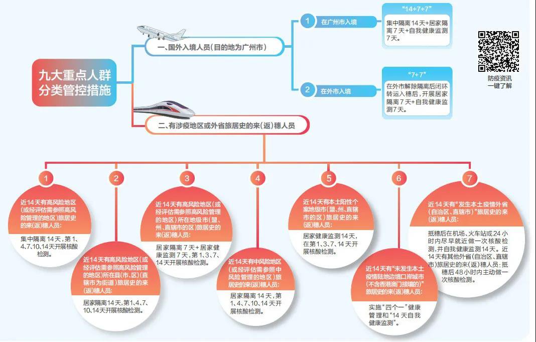 1、近14天有中风险地区(或经评估需参照中风险管理的地区)旅居史的来(返)穗人员:居家隔离14天,第1、4、7、10、14天开展核酸检测。