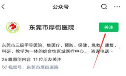 扫描医院公众号二维码或者搜索“东莞市厚街医院”关注医院公众号。