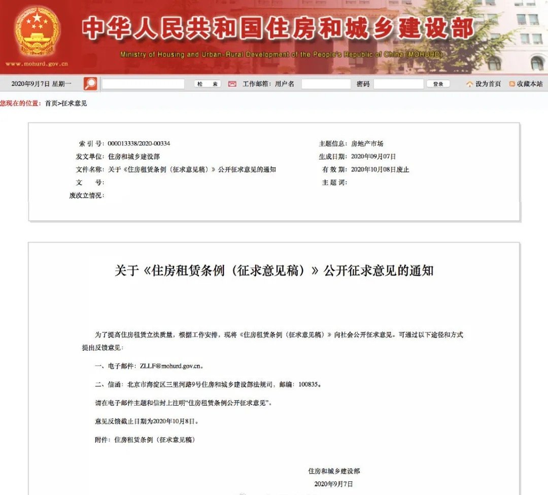 9月7日,住建部发布通知,就《住房租赁条例(征求意见稿)》向社会公开征求意见: