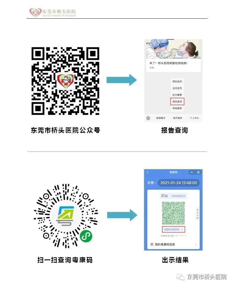 1.关注“东莞市桥头医院”公众号,24小时后可登录桥头医院公众号查询检测结果。
