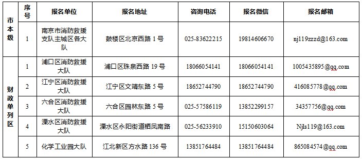 报名方法:填写报名表格(附件2)《南京市消防救援支队公开招聘政府专职消防员报名登记表》发送至对应报名单位的邮箱并添加微信(添加时需备注姓名、报名岗位、年龄、学历、兵龄)。