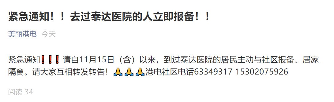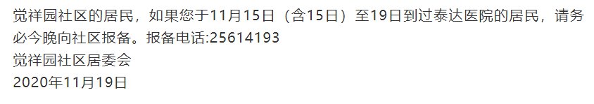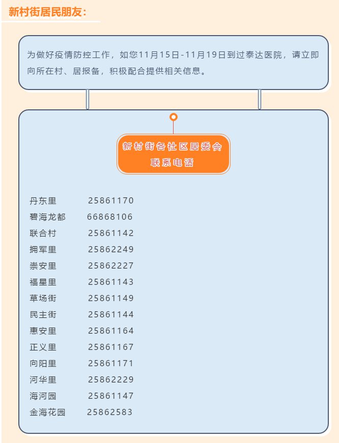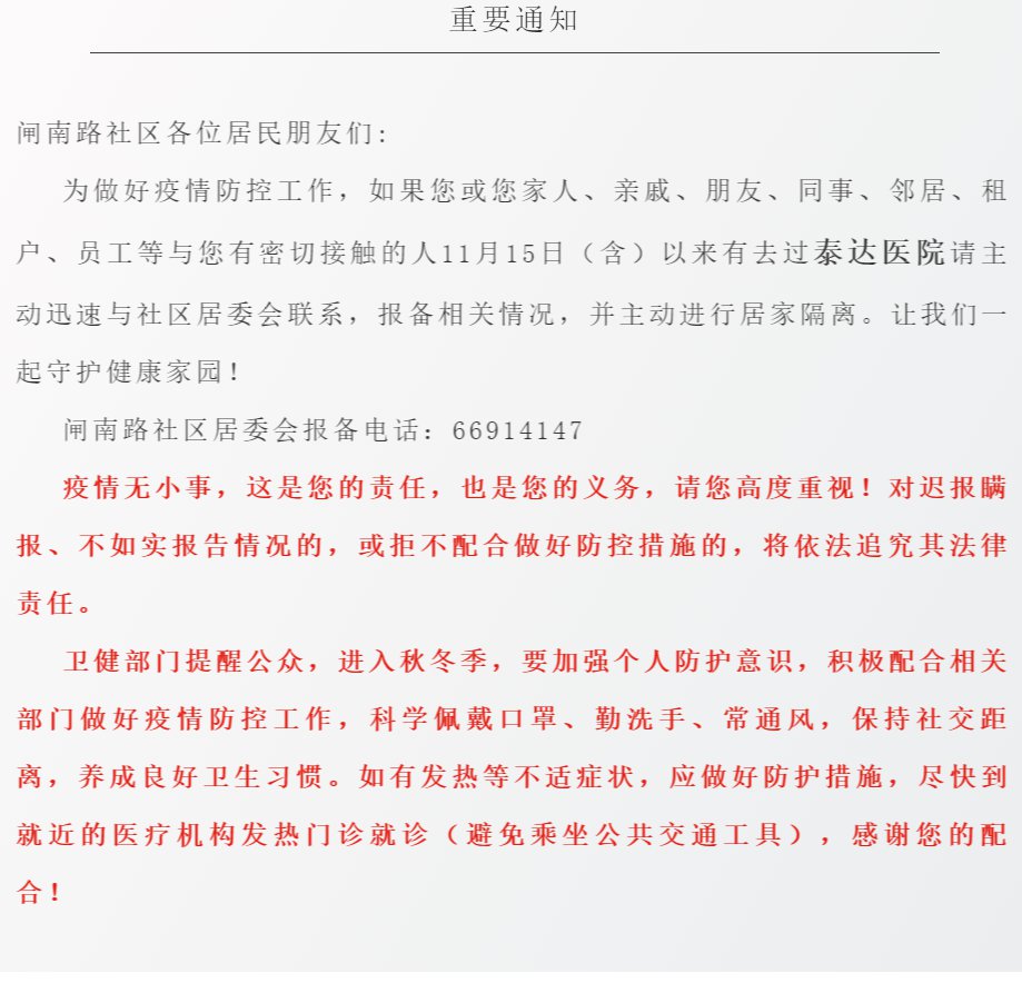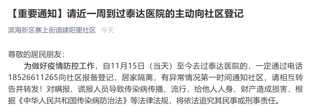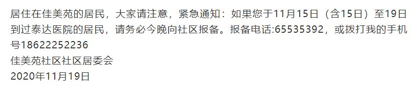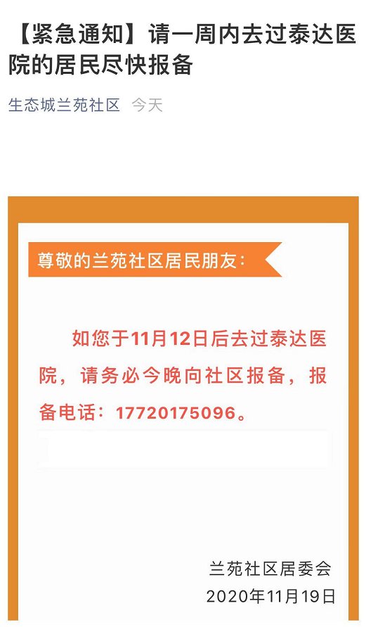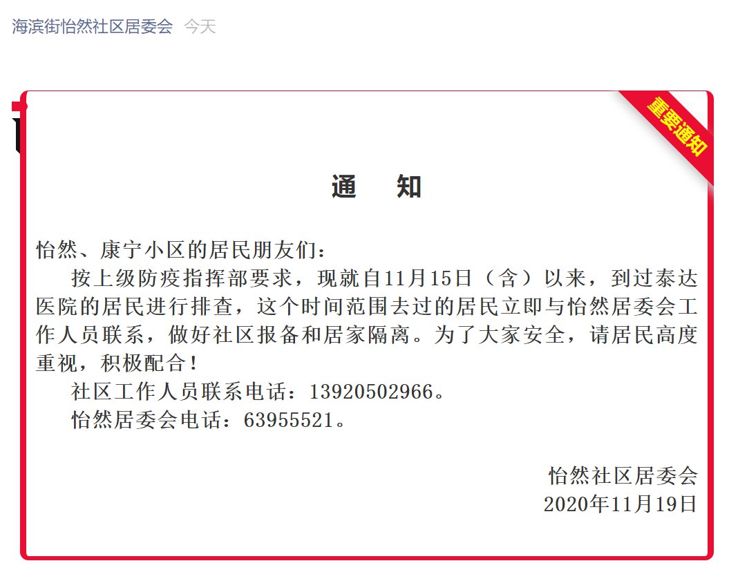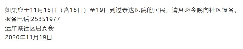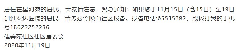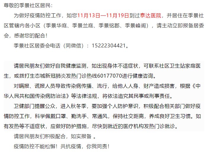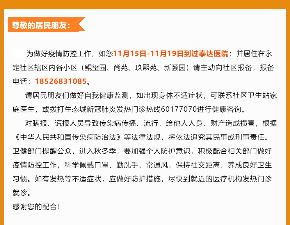 11月15日-11月19日到过泰达医院,并居住在永定社区辖区内各小区(鲲玺园、尚苑、玖熙苑、新颐园)请主动向社区报备