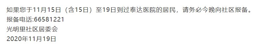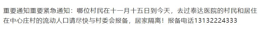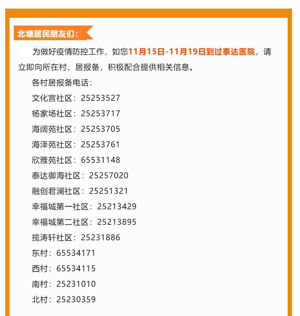 提醒11月12日后去过泰达医院的居民当天晚上向社区报备,公告如下: