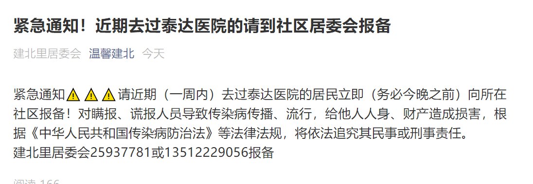 ➤滨海新区多个社区发布公告提醒去过泰达医院的居民主动向社区报备如下(不完全统计):