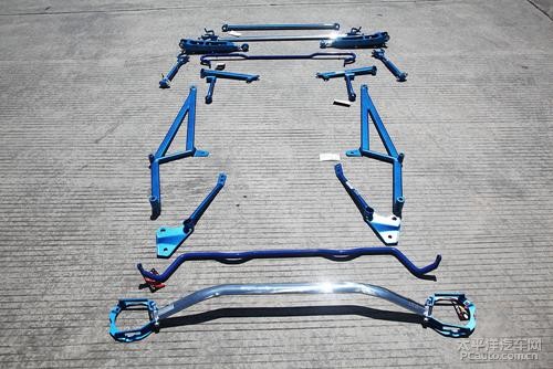 设计安装于前桥与车架底盘前方的连接部位。主要作用是增强前底横梁(前桥)与底盘的连接强度,减小离心力与车身扭曲造成的前桥位移形变,其主要作用同样是改善过弯性能;