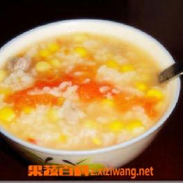 把米和红萝卜放到电饭煲里先煲开,煲开后加入玉米粒和蕃茄,堡至米熟再放入瘦肉,再煲五分钟左右,加盐和油,起锅