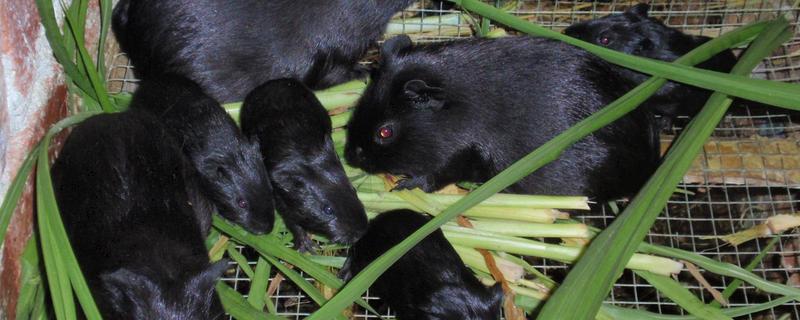 黑豚原产于中国云南山区,属哺乳纲啮齿属动物,体型适中(0.75-1.25公斤),四肢粗短,头钝圆,吻大,眼小耳短,爪较长,其显着特征是全身黑毛、黑眼、黑耳、黑脚,无尾巴,不擅于跳跃,一般不咬人、抓人。黑豚性情温和,喜欢群居,听觉敏锐,胆小,怕惊讶。黑豚在不同的情况下会发出不同的叫声,如当母豚发情时,公豚发出咕噜、咕噜的求情曲,饥饿时听到脚步声发出哜哜的尖叫声。