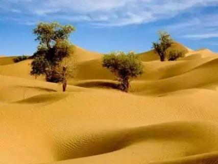 塔克拉玛干沙漠,系暖温带干旱沙漠,酷暑最高温度达67.2℃,昼夜温差达40℃以上。这里,金字塔形的沙丘屹立于平原以上300米。狂风能将沙墙吹起,高度可达其3倍。沙漠里沙丘绵延,受风的影响,沙丘时常移动。沙漠里亦有少量的植物,其根系异常发达,超过地上部分的几十倍乃至上百倍,以便汲取地下的水分,那里的动物有夏眠的现象。