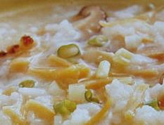 主料:籼米100克,辅料:干贝25克,鸡肉50克,荸荠50克,鲜香菇50克,调料:猪油5克,料酒10克,盐2克,大葱3克,姜2克,胡椒粉1克